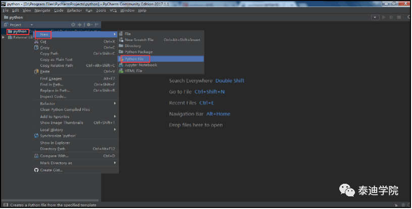 新建好项目(此处项目名为python)后,接下来要新建一个.py文件。右键单击“python”这个项目名,选择“New”栏下的“Python File”,如图2-1所示。