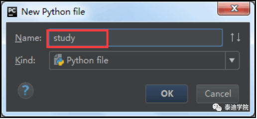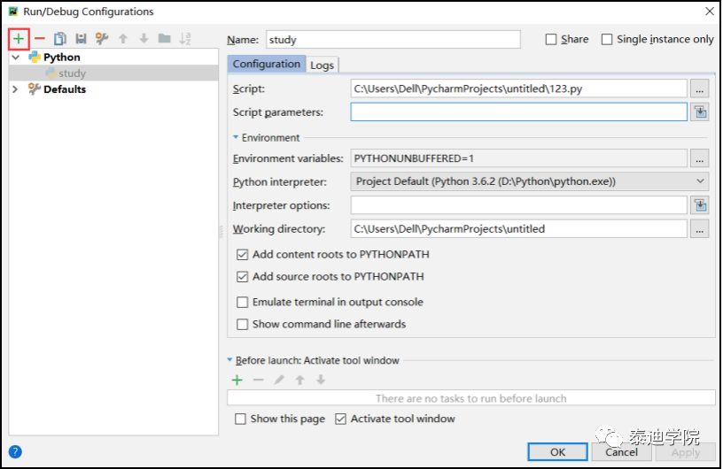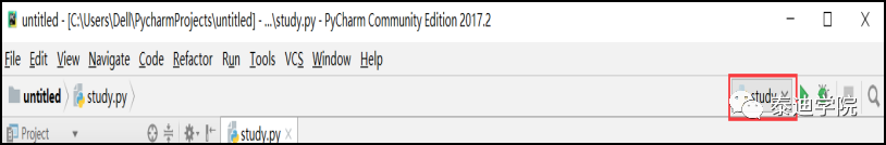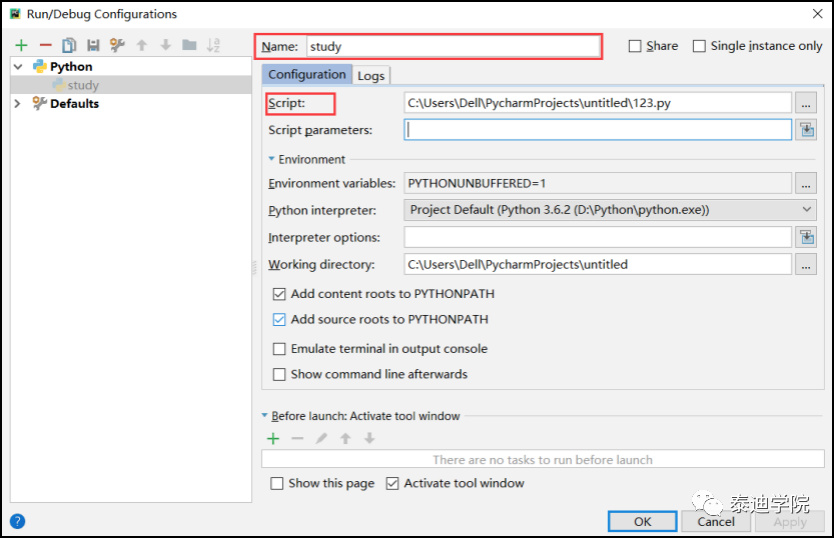 在右边的配置界面中,Name一栏里填写一个名字,单击Scrip选项,找到刚刚新建的study.py文件,如图2-6所示。单击“OK”按钮之后,运行的符号就会变成绿色的,此时就可以正常编程了。