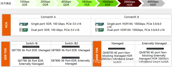 作为最早实现RDMA的网络技术,IB(InfiniBand)网络凭借着从硬件到软件的全栈全场景的技术集成,可以天然支持RDMA技术,不过因为要用到专业的硬件设备(IB网络主流设备如图2所示。)所以在部署时需要承担比较高的成本。IB网络架构具体如图3所示,核心组件如下: