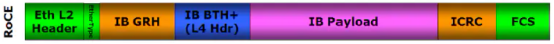 RoCEv2 的协议栈包括IB传输层、TCP/UDP、IP 和 Ethernet,其中后面三层都使用了 TCP/IP 中相应层次的封装格式(遵循传统封装标准)。UDP 包头中,目的端口号为4791即代表是 RoCEv2 帧。IB BTH (InfiniBand Base Transport Header)定义了IB传输层的相应头部字段。IB-Payload 代表消息负载。ICRC 和 FCS 分别对应冗余检测和帧校验。