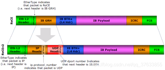 在RoCEv1中,infiniband的链路层协议头被去掉,用来表示地址的GUID被转换成以太网的MAC。RoCE依赖于无损的以太网传输,这要求传统以太网知识PFC以及ECN技术支撑,势必会给以太网的部署带来成本和管理上的开销。