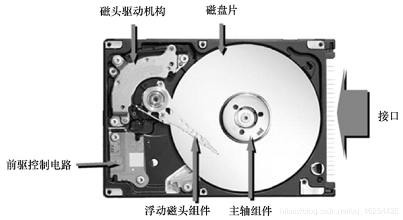 我们通常说的硬盘主要是指机械硬盘,它主要由盘片和主轴组件、浮动磁头组件、磁头驱动机构、前驱控制电路和接口等组成,如下图