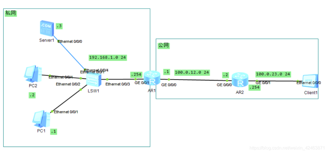 本次文章通过搭建一个小型的网络拓扑,来熟悉NAT的基本配置,以下内容是在华为ensp的模拟器上进行的,如下图所示,