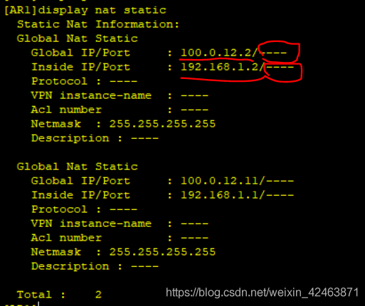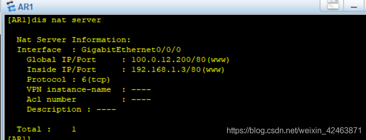 可以通过display nat server 来查看AR1上的NAT服务器配置结果,如下图所示,