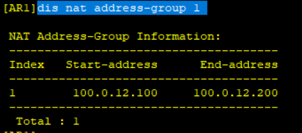 [AR1]nat address-group 1 100.0.12.100 100.0.12.200 配置NAT地址池,地址池内的ip地址从100.0.12.100 到100.0.12.200共101个。
