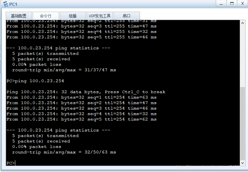 接着,我们可以用PC1去访问外网中ip地址为100.0.23.254的接口,如下图所示是可以ping通的。