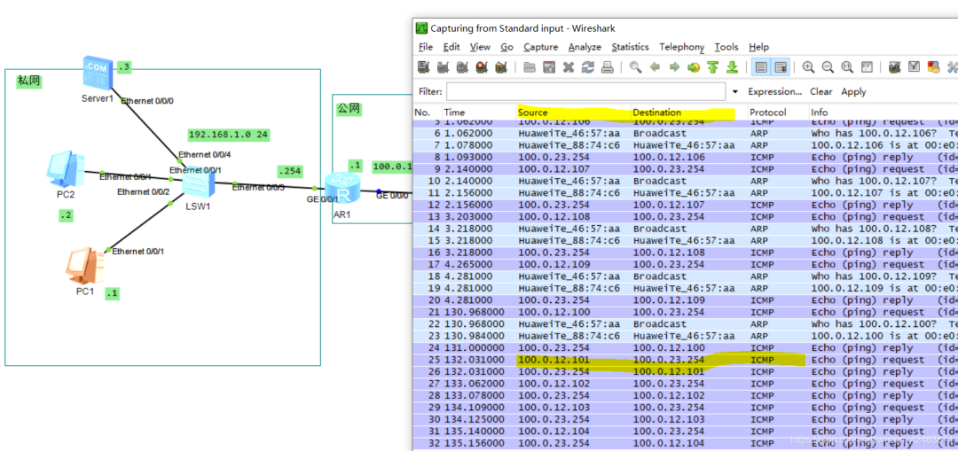 在AR1的G0/0/0口进行抓包,如下图所示,目的ip和源ip都变成了公网地址,也就是说,出口网关将私网ip地址转换成了公网IP地址,将数据包发送了出去。