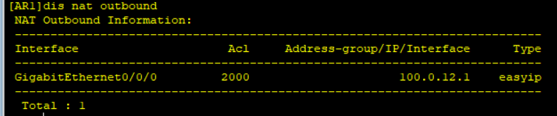 [AR1-GigabitEthernet0/0/0]nat outbound 2000