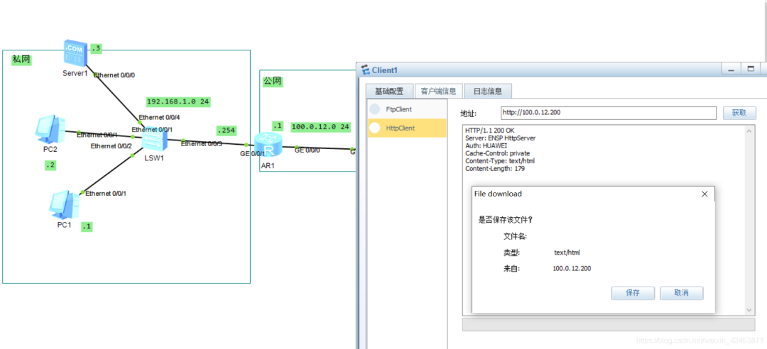 做完之后,我们可以在公网中的Client上,去网文AR1上绑定的服务器的公网地址100.0.12.200,如下图所示,我们可以看见成功访问了。