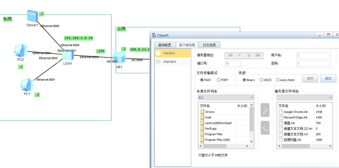 做完之后,我们可以在公网中的client1上去访问私网中的ftp服务器,如下图所示,可以成功的访问ftp服务器。