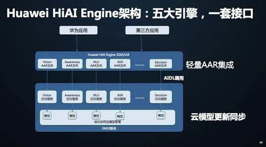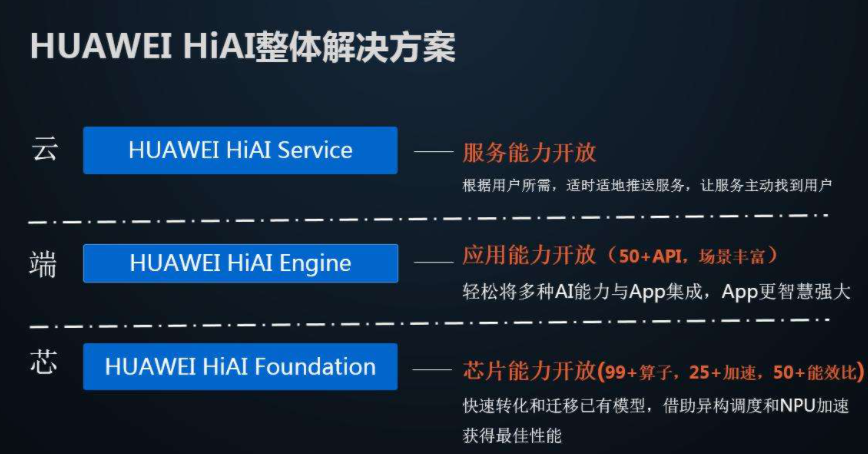 • HiAI是面向移动终端的AI能力开放平台,构建三层AI生态:服务能力开放、应用能力开放和芯片能力开放。端芯云结合的三层开放平台为用户和开发者带来更多的非凡体验。