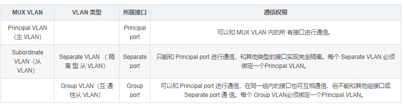 MUX VLAN 分为 Principal VLAN 和 Subordinate VLAN,Subordinate VLAN 又分为 Separate VLAN 和 Group VLAN,如下图所示: