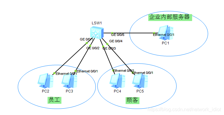 例如,在企业网络中,企业员工和企业客户可以访问企业的服务器。对于企业来说,希望企业内部 员工之间可以互相交流,而企业客户之间是隔离的,不能够互相访问。