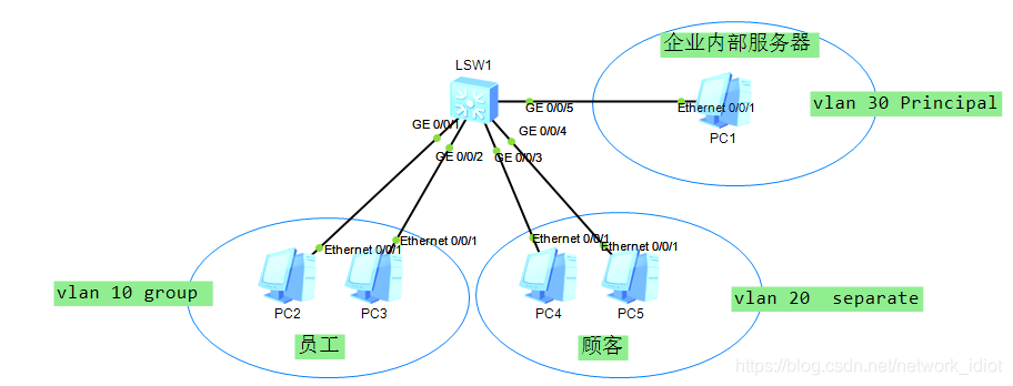 通过将企业内部服务器划入主VLAN,员工和顾客划入从VLAN,并且将员工设置为互通型从VLAN,这样员工内部就能互通了,而吧顾客设置为隔离型从VLAN,这样顾客之间就隔离了。
