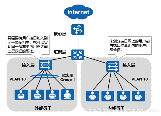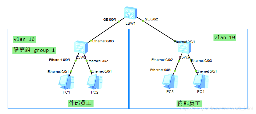 某公司网络部分如上图所示,该公司希望内部员工能跟外部员工互访,但是外部员工之间不能互通。在这种情况下使用普通的VLAN过于浪费VLAN资源,使用MUX VLAN也没有必要,因此我们可以直接将外部员工都配置成隔离组1即可。