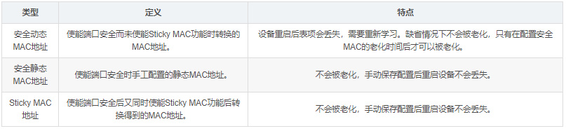 端口安全(Port Security)通过将接口学习到的动态MAC地址转换为安全MAC地址(包括安全动态MAC、安全静态MAC和Sticky MAC)阻止非法用户通过本接口和交换机通信,从而增强设备的安全性。