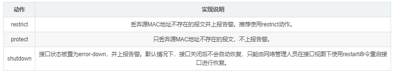 接口上安全MAC地址数达到限制后,如果收到源MAC地址不存在的报文,端口安全则认为有非法用户攻击,就会根据配置的动作对接口做保护处理。缺省情况下,保护动作是restrict。