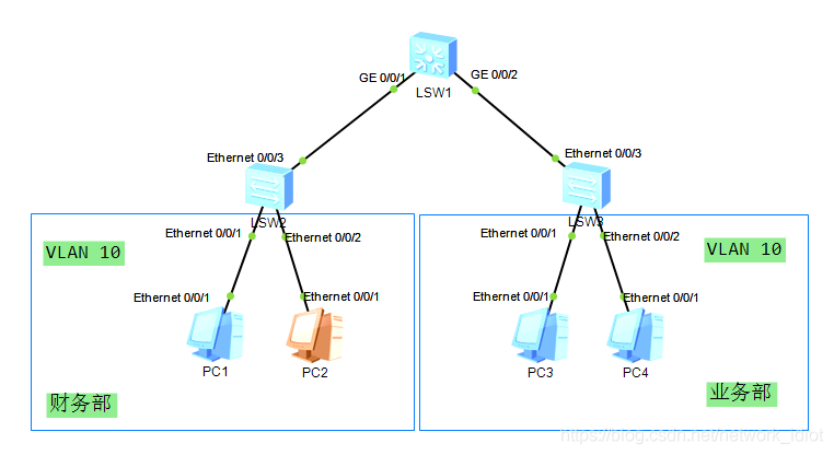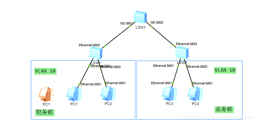 如上图所示,公司有财务部和业务部,已知每个部门目前只有2台设备上网,这是配置端口安全,给财务部的端口配置stickyMAC地址,给业务部配置动态MAC地址,默认最大接口获取MAC数量都为1不改变,然后配置汇聚层LSW1上2个端口使能端口安全,配置动态获取MAC地址,并配置最大学习MAC地址数为2.不改成2的话LSW1一个端口只能学习到一个MAC地址,这会造成部分用户之间不通的情况。