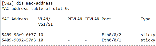 接口使能Sticky MAC功能时,接口上的安全动态MAC地址表项将转化为Sticky MAC地址,之后学习到的MAC地址也变为Sticky MAC地址。
