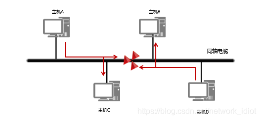 在冲突域中设备均处于半双工的工作模式,半双工指的是设备既可以接收数据也可以发送数据,不过同一时间下只能执行一个动作,而总线型的网络架构使得数据在发送的时候容易产生冲突。例如上面所示,主机A在发送数据时,主机D也同时发送了一个数据,单个链路中同时存在2个相反方向的电流,即产生了冲突。这时候就要使用CSMA/CD技术,简单来讲这个CSMA/CD就是解决总线型网络架构下的数据冲突问题。