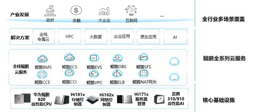 鲲鹏计算产业是基于Kunpeng处理器构建的全栈IT基础设施、行业应用及服务,包括PC、服务器、存储、操作系统、中间件、虚拟化、数据库、云服务、行业应用以及咨询管理服务等。