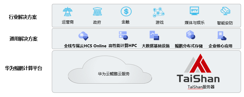 基于华为鲲鹏计算平台(云平台或物理平台)的解决方案分为通用解决方案及行业解决方案,通用解决方案包括全栈专属云HCS Online、高性能计算HPC、大数据基础设施、分布式存储、企业核心应用等,行业解决方案包括运营商、政府、金融等。