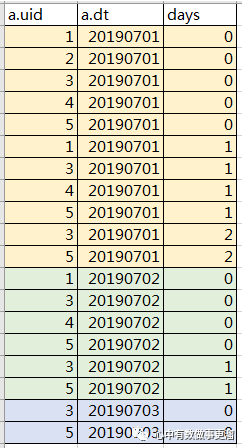 /* 构建辅助字段days表示留存的天数,从0开始的整数*/