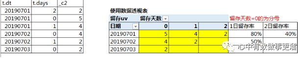 以次日留存率为例=次日留存用户数/当日访问用户数,可以通过left join来实现查询,但如果要一次性计算多天的可以构造一个留存天数的辅助列来实现: