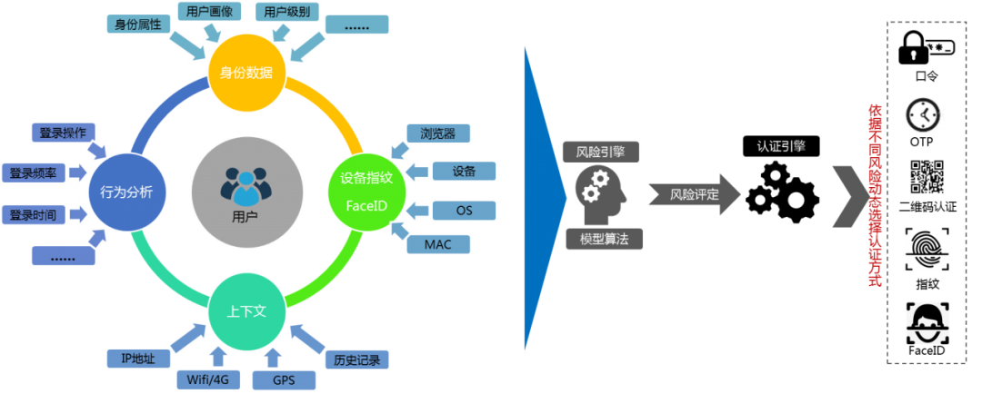 更可基于用户行为的风险识别,支持根据用户所在地点、终端、访问习惯等场景信息,制定差异化的认证策略,利用大数据技术和AI算法,以身份数据为基础建立风险引擎,引入风险模型算法,根据用户访问习惯、特征判别风险等级,智能化身份识别验证。