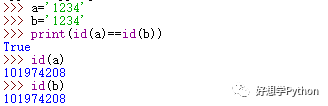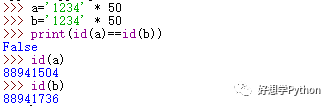 ② 测试长字符串:我们对a、b分别赋值'1234'*50,赋值操作后,检查id,发现实际上a跟b却指向不同的内存区域,id不一致,但两个区域分别都储存了“1234”这个数据。