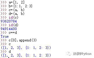 我们对a、b分别赋值[1, 2]、{1:1, 2:3},再对c、d分别赋值(a, b),赋值操作后,检查c与d的id,发现实际上c跟d指向不同的内存区域,分别储存了(a, b)这个数据。检查c==d,由于内容相同,尽管两者id不同,也会返回True。对c[0](即a的变量引用)作增加元素操作,增加了“3”,c[0]变成了[1, 2, 3],输出c、d发现结果都随之变化了!