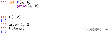 ① 对于序列类型(*),通过这种操作,Python将自动把序列类型实例中的每个元素按顺序传入参数,在这个具体例子中,效果为a=args[0],b=args[1],args的长度必须与这里定义的函数f的参数个数一致,都是2个,否则报错。
