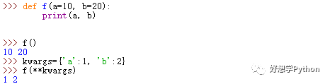 ② 对于字典类型(**),通过这种操作,Python将自动把字典类型实例中的每个键值对,按照与参数名的对应关系进行传入参数,在这个具体例子中,效果为a=kwargs.get('a'),b=kwargs.get('b'),kwargs中的key(键)必须与对应的参数名称一致,不能出现函数参数中未出现的名称,否则报错。