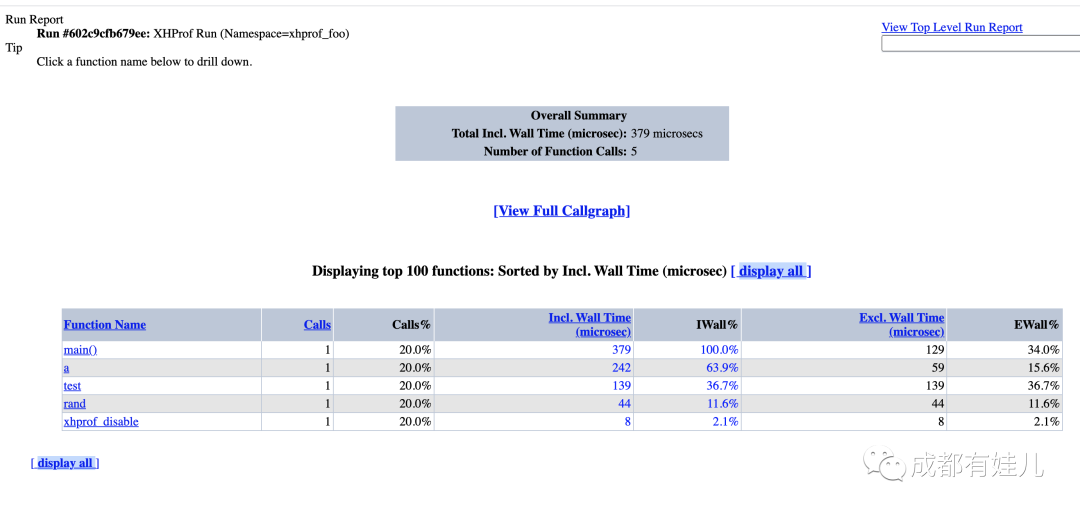 在浏览器中访问http://xhprof.alice.show/test2.php,就可以看到页面最后打印出了类似输出:http://xhprof.alice.show/xhprof_html/index.php?run=602c9cfb679ee&source=xhprof_foo