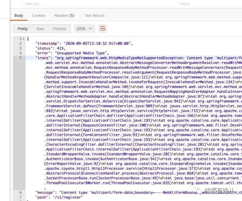 如果在Postman中使用form-data或者x-www-form-urlencoded方式,如图2所示,则会有JSON parse error。