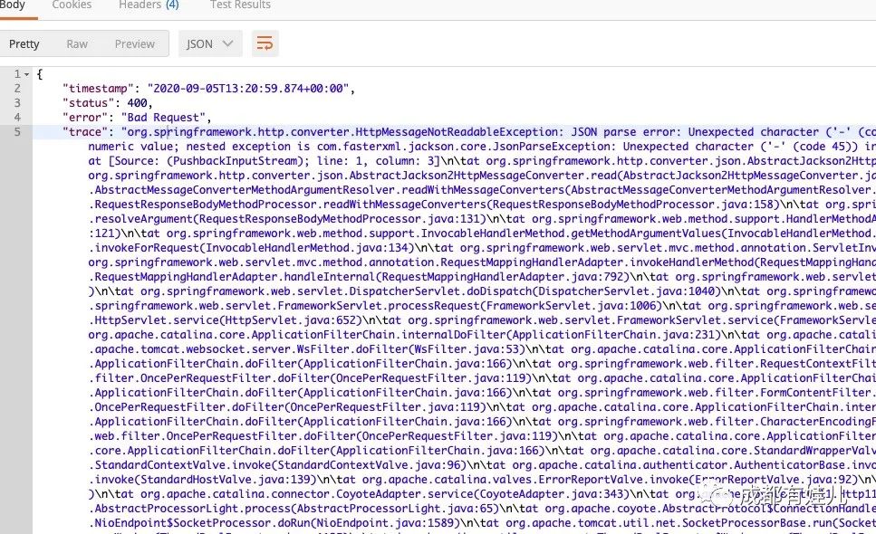千万别以为自己使用的第三方json包出问题了,网上还有人说是因为使用的jackson的版本和Spring Boot版本不匹配,其实真不见得是这个问题。正确的做法是,使用raw方式填写json字符串即可,如图3所示: