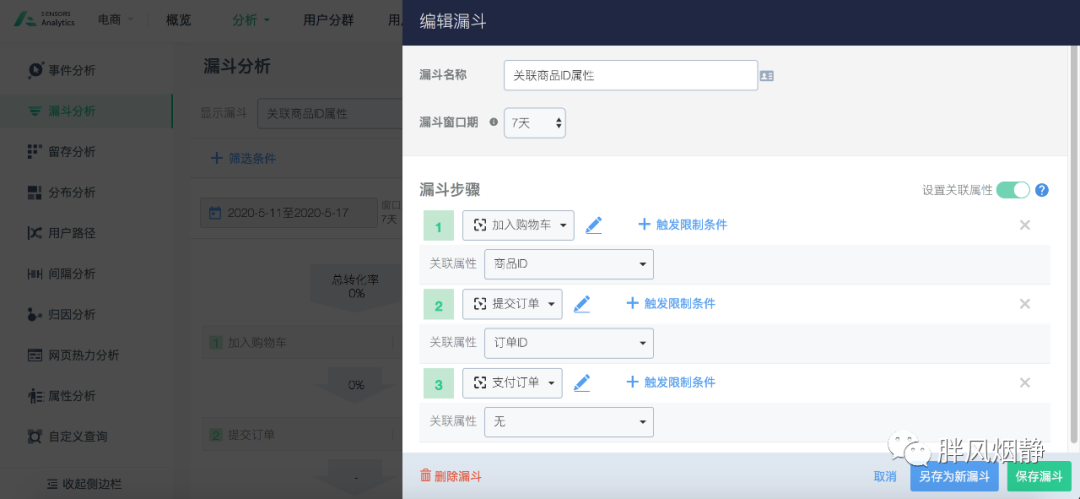 如果我们考察商品购买的情况,我们会构建漏斗为浏览商品详情页 -> 提交订单 -> 支付订单,这时候如果我们不设置这三个事件之间的属性关联,则可能会出现用户浏览商品详情页和提交订单的两个事件中不是同一个商品,例如之前浏览了IPhone8,但是提交订单的时候提交的是小米10。或者,当我们只想查看小米10的转化情况时,如果我们在商品浏览页设置了商品名称是小米10,但是没有设置关联属性的话,可能出现的就是虽然浏览商品页是小米10,但是从提交订单,到支付订单,就都不是小米10了。