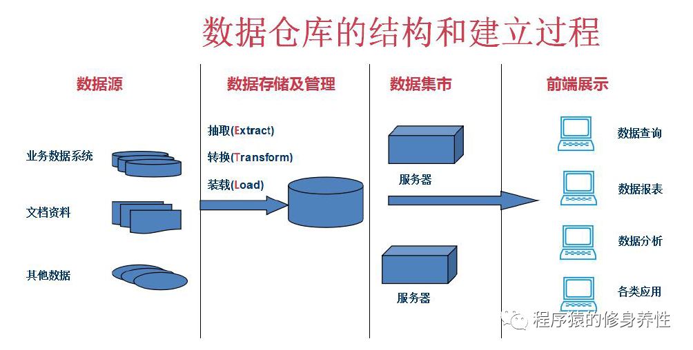 从上图可以看出,数据仓库的基本架构主要包含的是数据的流入和流程过程,可以分为三大部分——数据源、数据仓库(包括数据存储及管理和数据集市)以及数据应用(前端展示)。数据仓库的数据来自于不同的数据源,并提供多样的数据应用,数据自左向右流入数据仓库后向上层应用程序开放应用,而数据仓库只是中间集成化数据管理的一个平台。数据仓库从各数据源获取数据及在数据仓库内的转换和流动,都可以认为是ETL(抽取Extra,转化Transfer,装载Load)过程,ETL是数据仓库的流水线,也可以认为是数据仓库的血液,它维系着数据仓库中数据的新陈代谢,而数据仓库日常管理和维护工作的大部分精力就是保持ETL的正常运作和稳定。