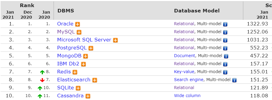 DB-Engines最近发布了 2021 年 1 月份的数据库排名。