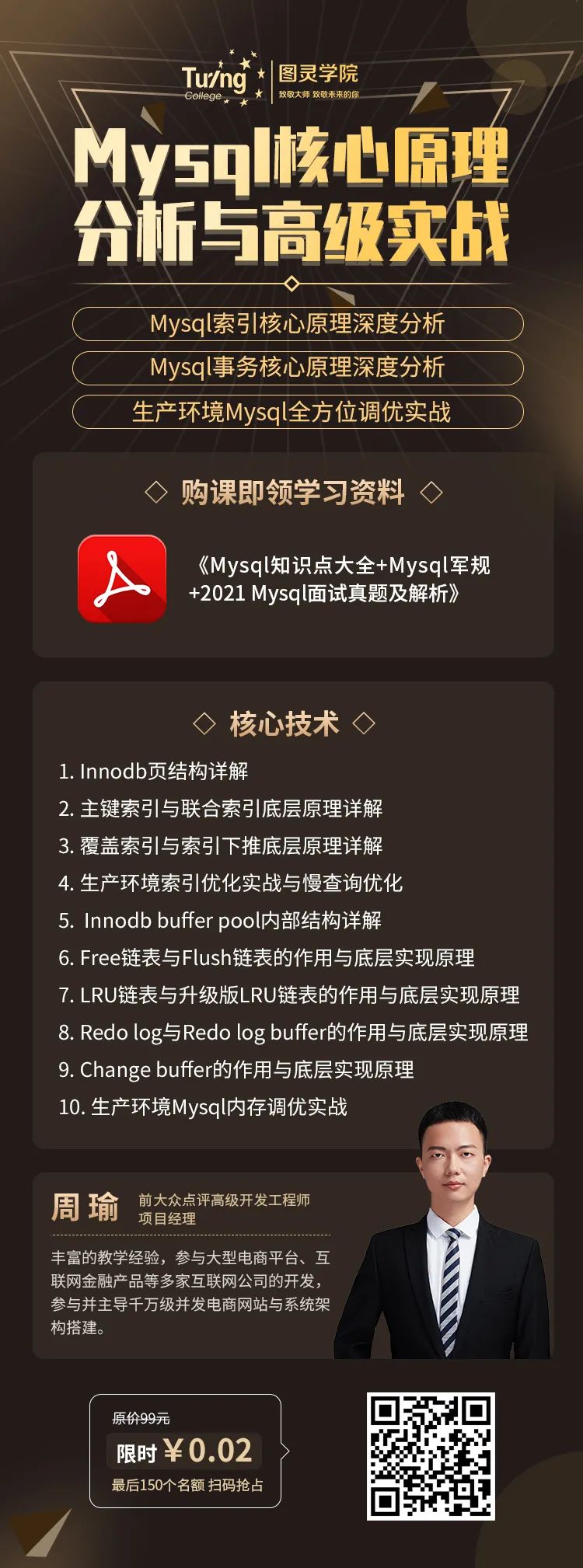 我也为我的粉丝争取到了150个优惠名额,原价99元,现在只需0.02元,还要到了一份三合一的硬核学习资料:《Mysql知识点大全+Mysql军规+2021 Mysql面试真题及解析》,扫码购课就能领!