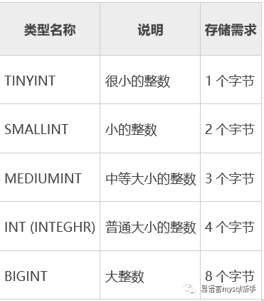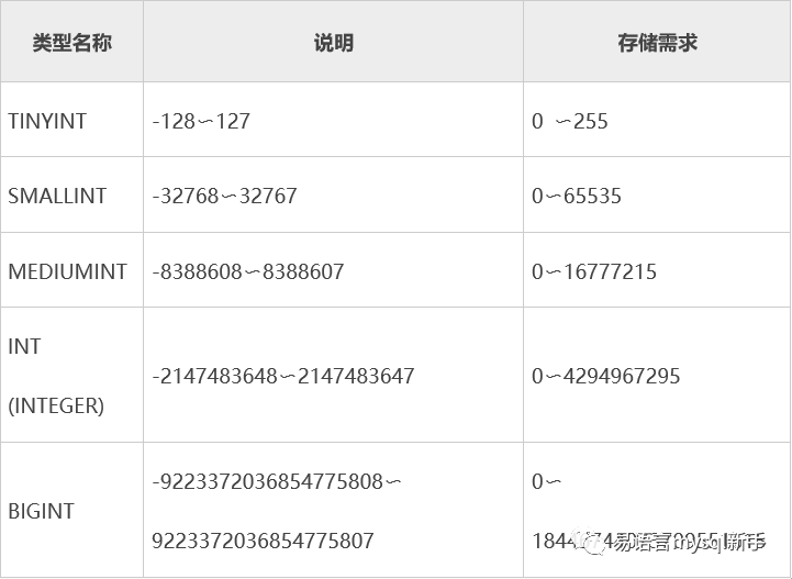 MySQL 主要提供的整数类型有 TINYINT、SMALLINT、MEDIUMINT、INT、BIGINT,其属性字段可以添加 AUTO_INCREMENT 自增约束条件。下表中列出了 MySQL 中的数值类型。