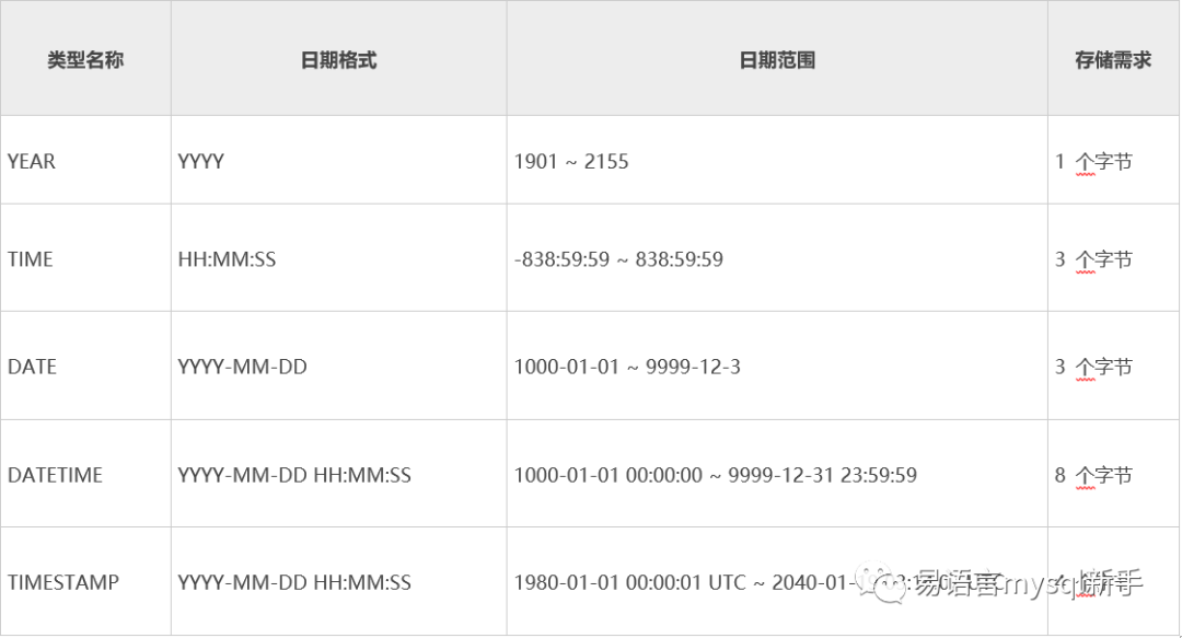 3、日期/时间类型:YEAR、TIME、DATE、DATETIME 和 TIMESTAMP。