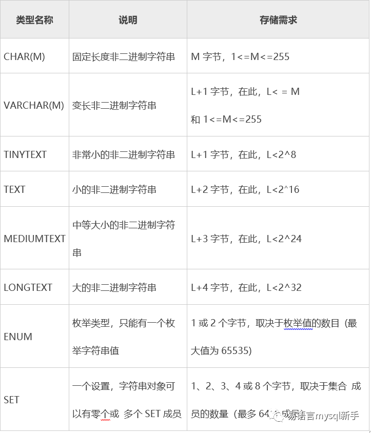 4、字符串类型:CHAR、VARCHAR、BINARY、VARBINARY、BLOB、TEXT、ENUM 和 SET 等。