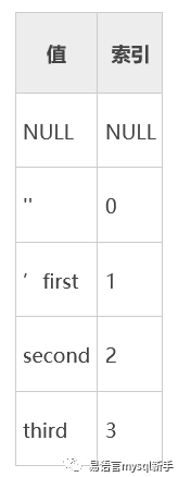 例如,定义 ENUM 类型的列('first','second','third'),该列可以取的值和每个值的索引如下表所示。