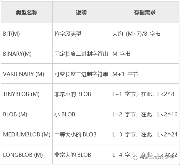 下表中列出了 MySQL 中的二进制数据类型,括号中的M表示可以为其指定长度。