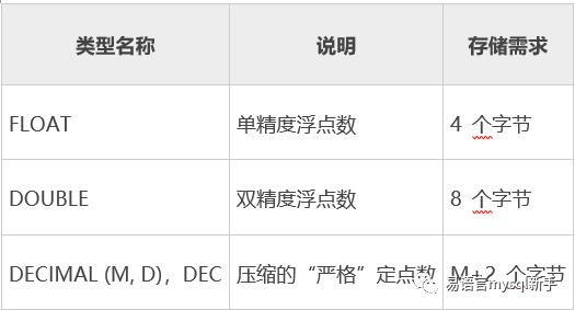 下表中列出了 MySQL 中的小数类型和存储需求。