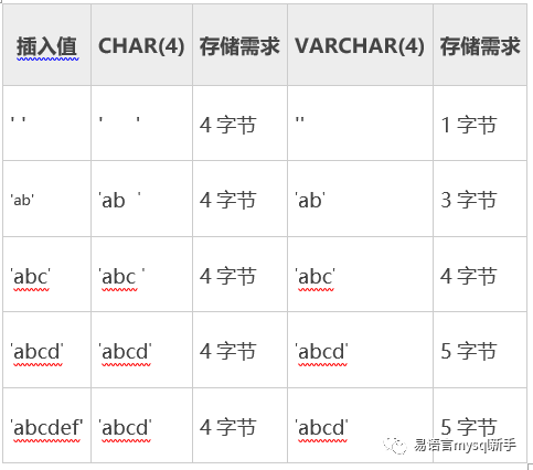 【实例】下面将不同的字符串保存到 CHAR(4) 和 VARCHAR(4) 列,说明 CHAR 和 VARCHAR 之间的差别,如下表所示。