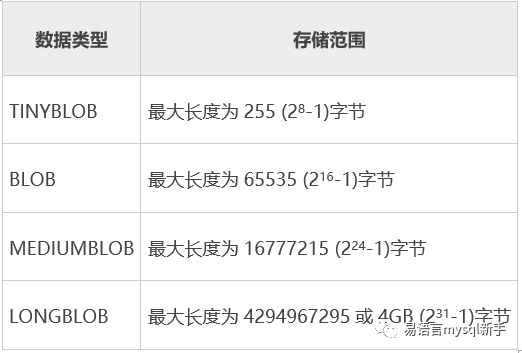 BLOB 是一个二进制的对象,用来存储可变数量的数据。BLOB 类型分为 4 种:TINYBLOB、BLOB、MEDIUMBLOB 和 LONGBLOB,它们可容纳值的最大长度不同,如下表所示。