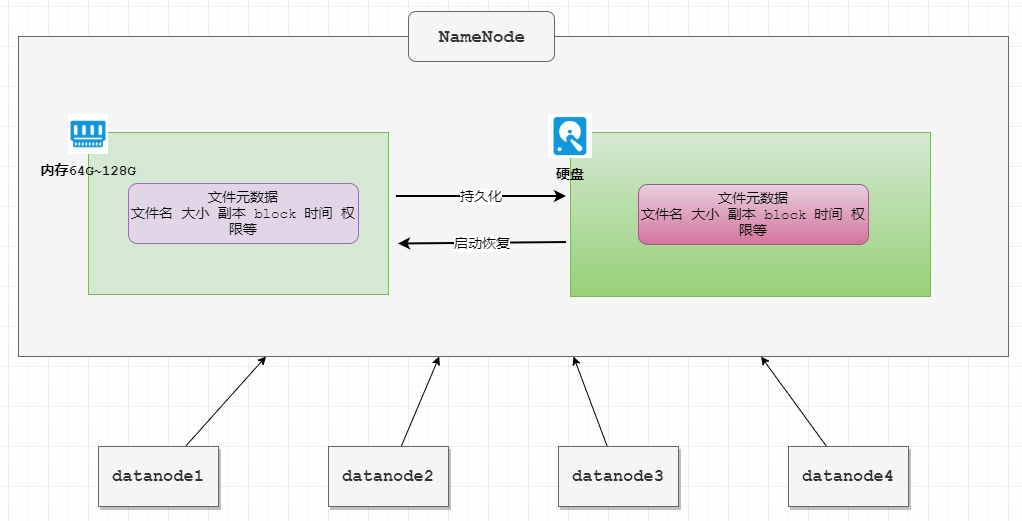 ③ 保存了元数据:文件名 路径 大小 所有者 所属组 权限 修改时间 副本数 块与datanode映射关系(通过这个才能到对应datanode获得真正的数据);