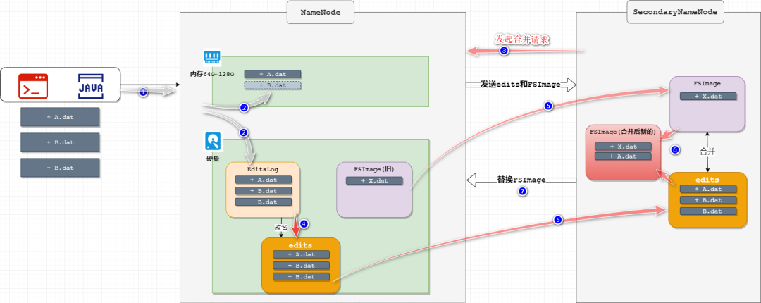 4. SecondaryNameNode负责将FSImage(旧)+edits文件合并成FSImage(新)